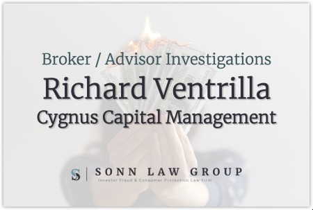 The Sonn Law Group is currently investigating allegations that Cygnus Capital Management and Richard Ventrilla committed fraud. We represent investors in claims against negligent brokers and brokerage firms. If you or your loved one experienced investment losses, we are here to help. For a free consultation, please call us now at 866-827-3202 or complete our contact form.