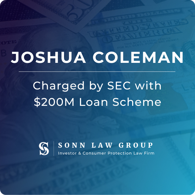 Attention Clients of Joshua W. Coleman: The SEC has alleged that the Pennsylvania-based former investment adviser fraudulently obtained hundreds of millions in loans by pledging over $160 million in client assets as collateral. If you were a client of Josh Coleman’s, you may have claims for damages.