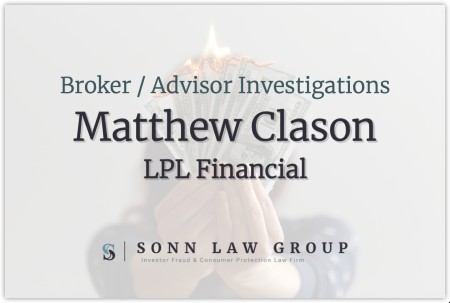 The Sonn Law Group is currently investigating allegations that Matthew Clason stole client funds. We represent investors in claims against negligent brokers and brokerage firms. If you or your loved one experienced investment losses, we are here to help. For a free consultation, please call us now at 866-827-3202 or complete our contact form.