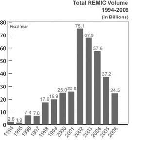 Ultimately, REMICs allow issuers to create securities with short, intermediate and long-term maturities, flexibility that in turn allows issuers to expand the MBS market to fit the needs of a variety of investors (and Wall Street’s desire to create new products). The amount of activity in REMICS increased dramatically over the past few years, as shown in the following chart: