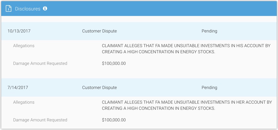 The most recently customer complaints listed on Mr. Sinkula’s BrokerCheck profile allege that Mr. Sinkula made unsuitable investments by creating a high concentration in energy stocks.