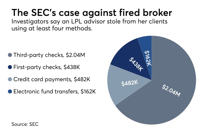An LPL Financial advisor stole at least $2.8 million from her clients to buy several homes and enrich herself during more than a dozen years of lying and forgery, according to the SEC.